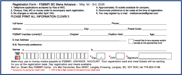 Bring your son, father, grandfather, grandson, pastor, business associate, friend or co-worker to this year’s Men’s Camp. You may also consider sponsoring someone to come or donate to the sponsorship fund. You will receive a “tax deductible receipt.”
